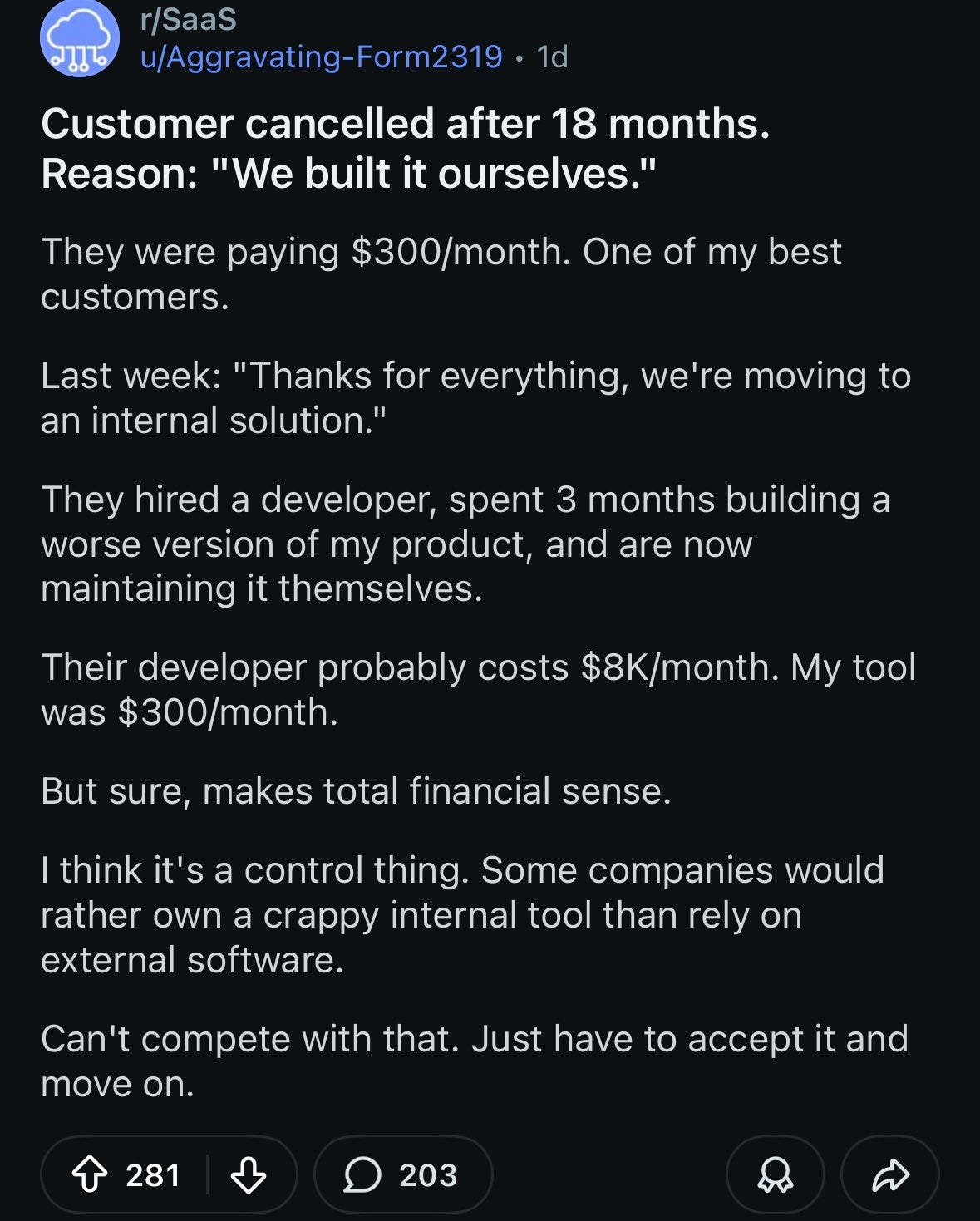 Empresas pequeñas gestionan todo con excel (clientes, proyectos, facturas, etc.) a costo casi cero, la empresa escala y se hace ineficiente (problemas de colaboración, de versionado, etc), se contrata un SaaS especifico con una UX bonita y mejores funciones que solo usar excel